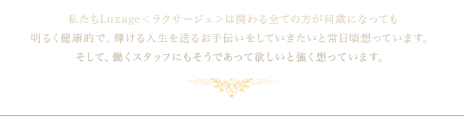 私たちLuxage<ラクサージュ>は、明るく思いやりを持ち、人としても成長したいと努力する。あなたのその“秘めたるポテンシャル”を採用します。当店で活躍していただけるスタイリスト、アシスタント、エステティシャンの方々を広く募集しています。
