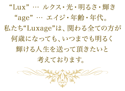 お客様一人ひとりと生涯お付き合いいただけるパートナーに指名していただけることが、私たちラクサージュの切なる願いです。「安心と安全」をテーマに、エイジング・マネージメントに重きを置いて、健やかで美しい心と身体を手に入れられるよう、さまざまなアプローチからキレイでいられるためのアドバイスをさせていただきます。私たちLuxage(ラクサージュ)は、思いやりを持って、思いやりをカタチにして、常に一人ひとりの「こうありたい」を追求してゆきます。